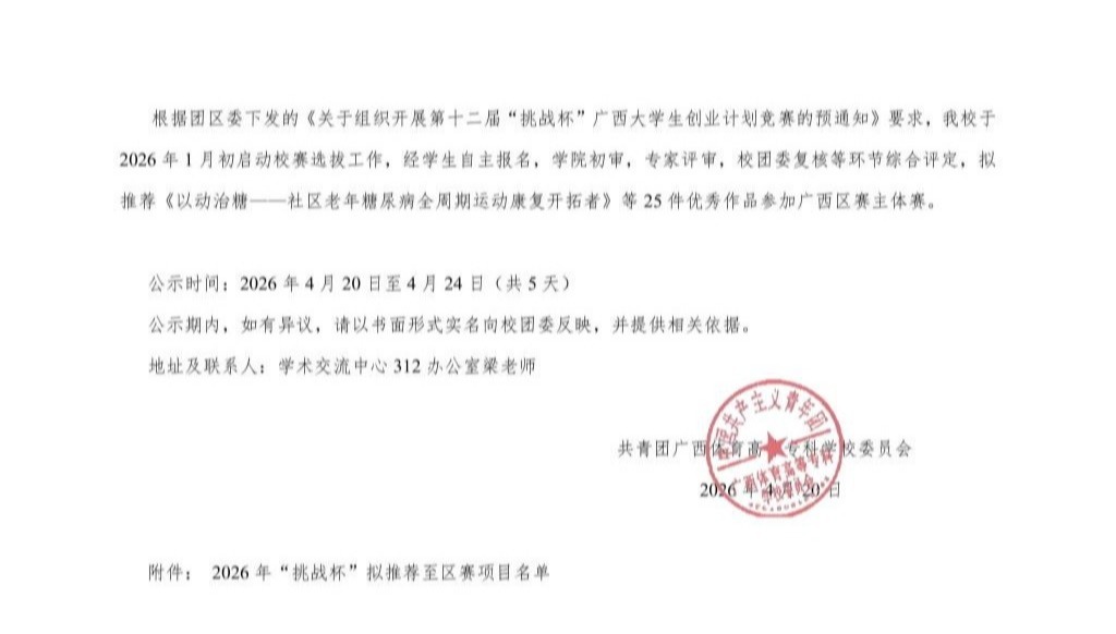 关于2026年“挑战杯”拟推荐至区赛项目名单公示