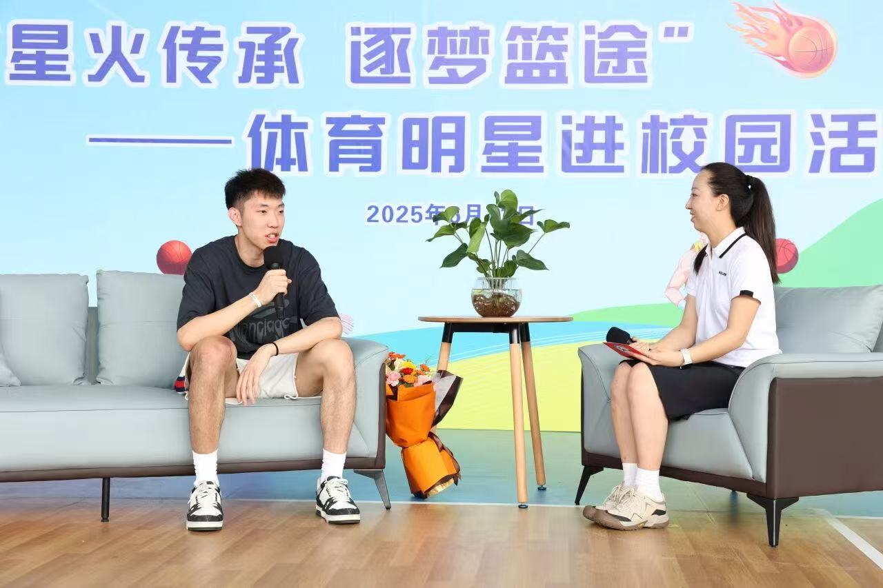 下午16:00,综合体育馆内,武术队的同学们以一曲刚劲有力的壮族舞蹈《俍兵破敌卫家园》拉开了活动的序幕。当廖三宁在欢呼声中入场时,访谈代表手捧鲜花迎上前说道:“学长,我们都看过你在CBA的比赛!”他笑着接过花束,腿上清晰可见的训练疤痕让现场的同学们瞬间感受到职业运动员的拼搏印记。紧接着访谈开始,以下是部分节选: