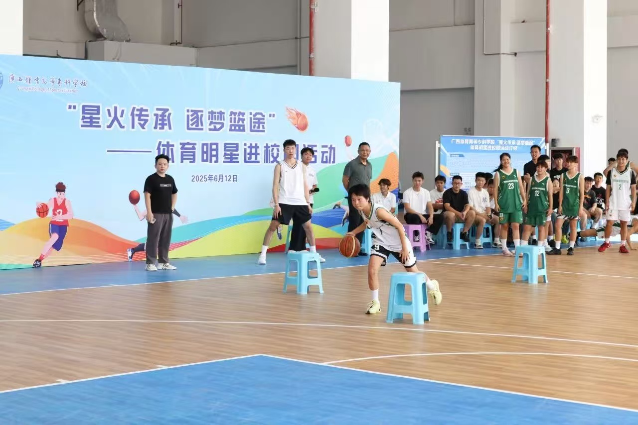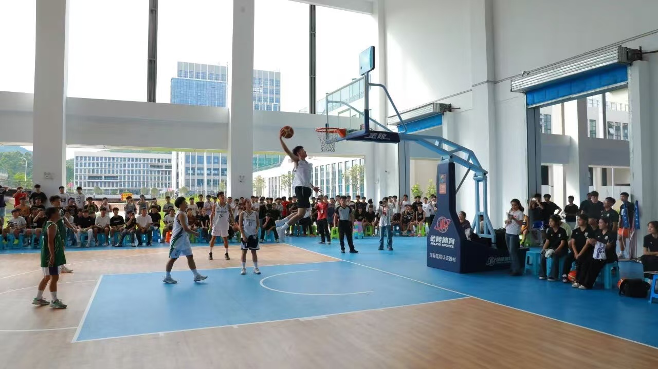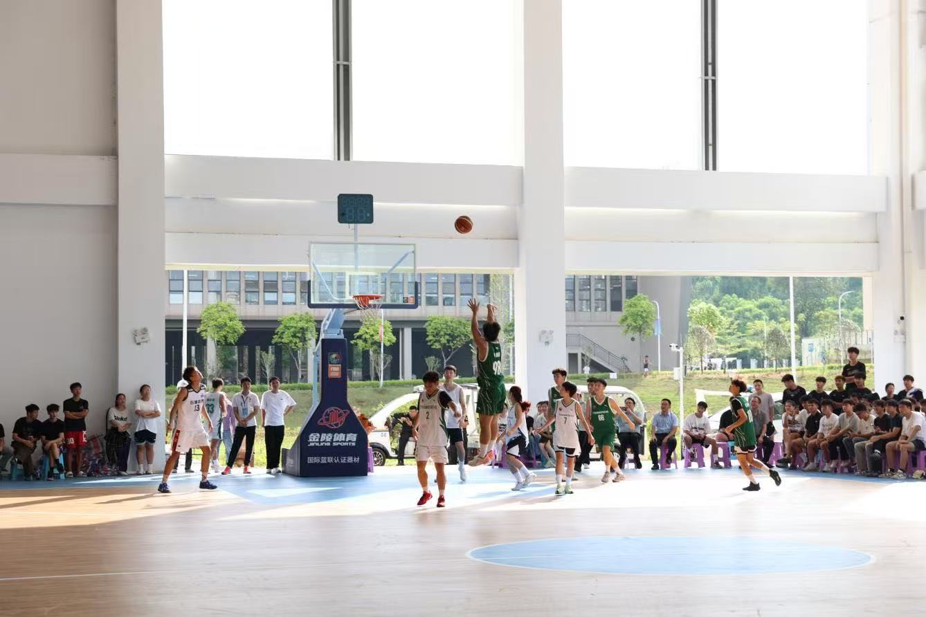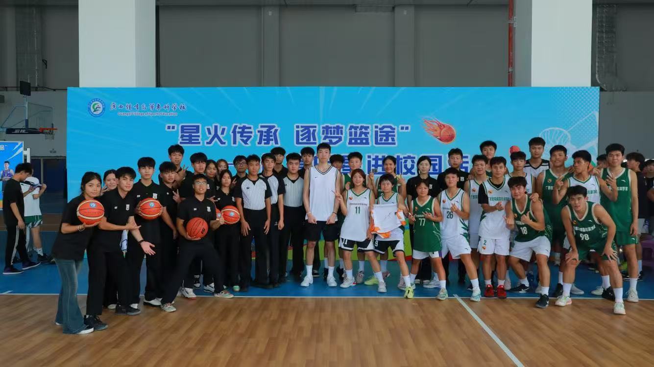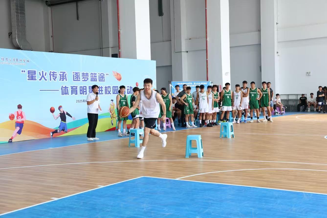 在综合体育馆的篮球场上,廖三宁亲自为校篮球队进行运球突破的特训。他以标志性的变向动作进行示范,并反复强调运球的细节。当一位队员出现动作失误时,他主动上前耐心纠正:“我们慢慢来,如果不熟练,就做五个俯卧撑再尝试,总能学会的。”在训练中,汗水浸透了他的队服,但他始终为同学们加油。在分组交流赛中,他加入了学生队伍,以一记记精准的传球和扣篮带动全场的节奏,欢呼声与掌声此起彼伏。