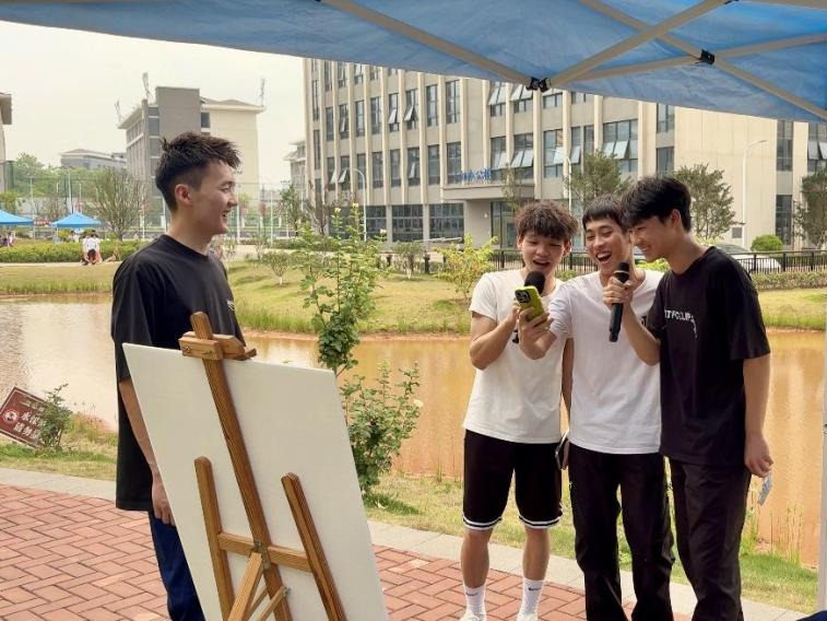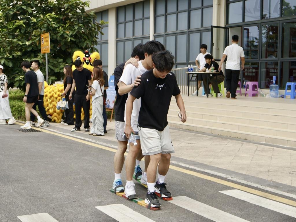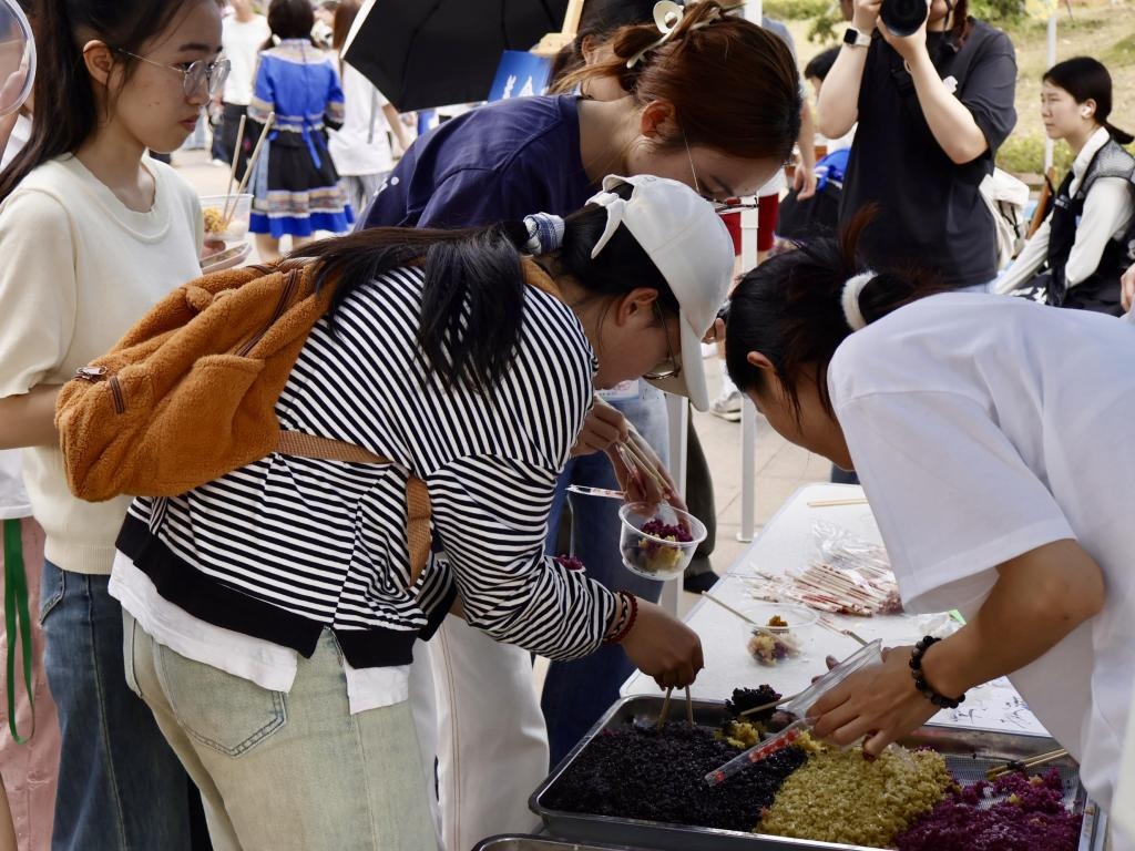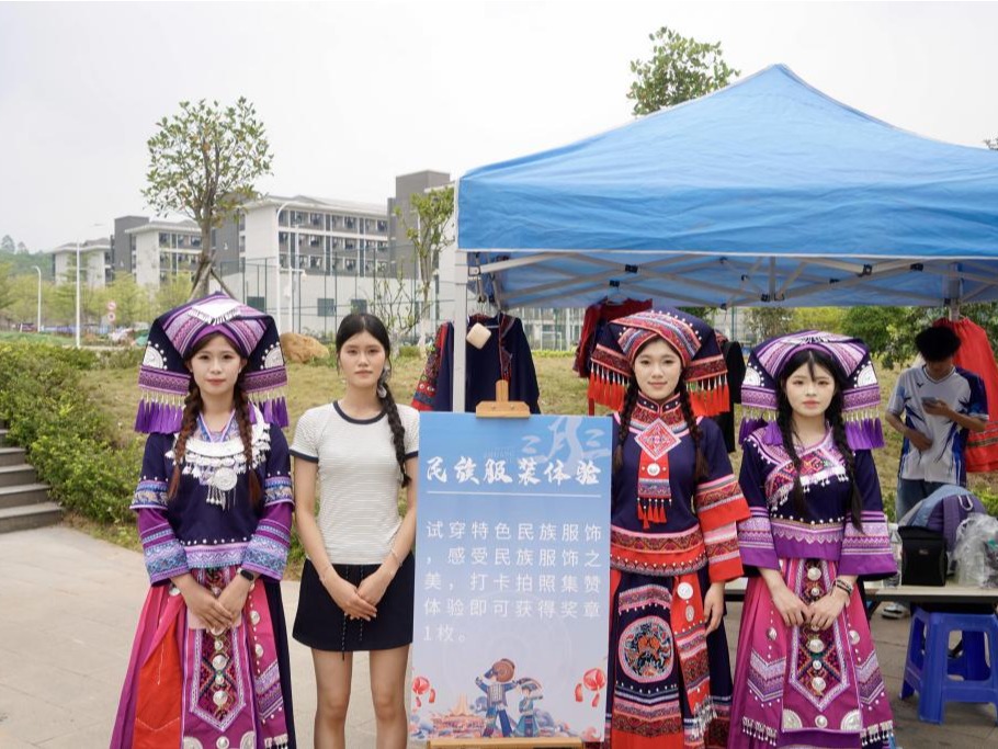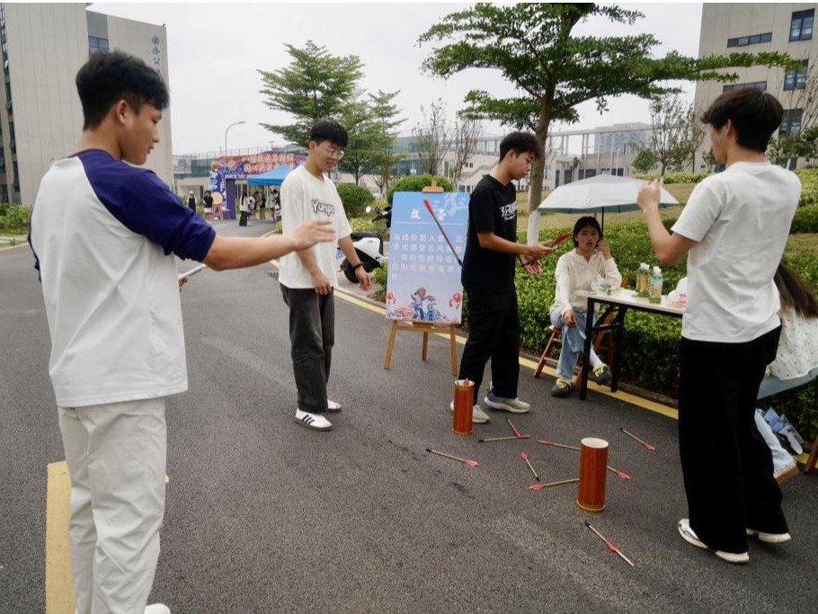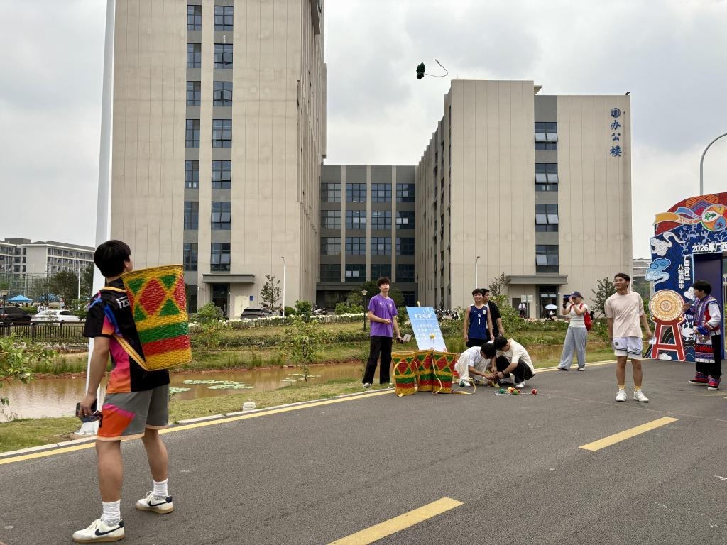在民族体育竞技区,背篓接绣球、同心板鞋竞速、竹竿舞、壮拳体验、投壶、陀螺、花样跳绳等项目趣味盎然,同学们踊跃参与、协作比拼,尽显体专学子的昂扬风貌。民族风情体验区内,香囊DIY、绣球与铜鼓制作等非遗体验深受欢迎;五色糯米饭等特色美食香气扑鼻;民族服饰打卡、山歌对唱、书法展示等活动吸引师生广泛参与,成为校园一道亮丽风景线。
