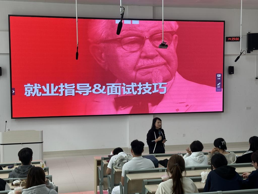 “规划你的职业生涯第一站”就业指导环节中,肯德基人力资源负责人罗丽宁结合食品健康行业发展趋势与企业人才需求,为学子们系统梳理了职业发展路径,分享了简历制作、职业定位的实用技巧,帮助大家清晰认知行业现状与自身发展方向,为未来就业做好充分准备。而在“解锁面试,自信登场”面试技巧分享环节,负责人罗丽宁通过模拟面试场景、解析常见面试问题等方式,细致讲解了面试中的礼仪规范、应答策略与心态调整方法,现场互动频繁,学子们积极参与交流,收获颇丰。