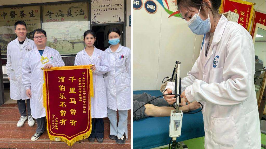 在贺州市中医医院,莫嘉锦同学为高龄、残疾患者提供轮椅租借和就诊陪护服务。“老奶奶紧紧握着我的手道谢,那一刻我真切感受到志愿服务带来的温暖。”在康复科,卢焕洁同学协助患者进行康复训练96小时,“康复不仅是技术操作,更是耐心、细心与爱心的传递。”