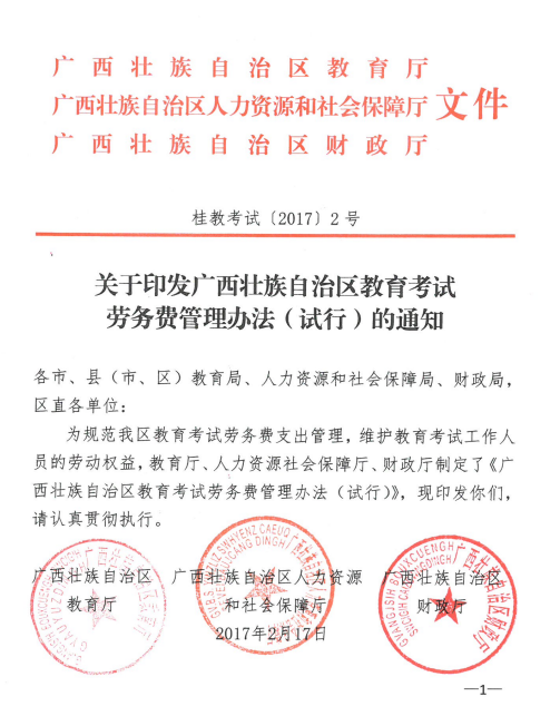 桂教考试〔2017〕2号关于印发广西壮族自治区教育考试劳务费管理办法(试行)的通知