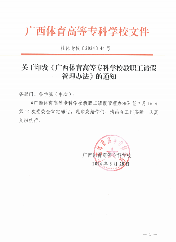 桂体专校〔2024〕44号 关于印发《广西体育高等专科学校教职工请假管理办法》的通知