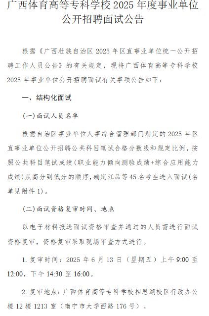 广西体育高等专科学校2025年度事业单位公开招聘面试公告