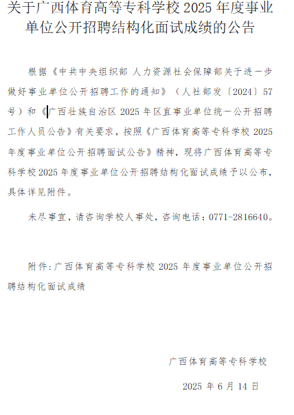 关于广西体育高等专科学校2025年度事业单位公开招聘结构化面试成绩的公告
