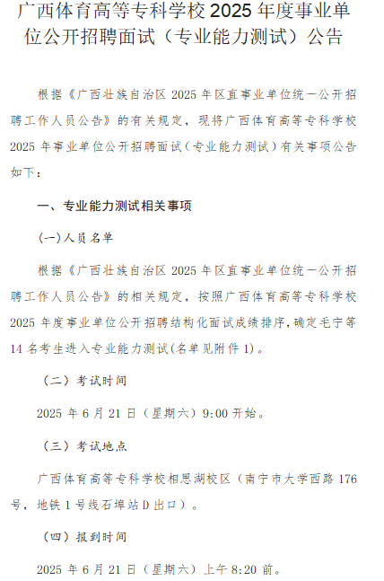 附件【广西体育高等专科学校2025年度事业单位公开招聘面试(专业能力测试)公告.docx已下载