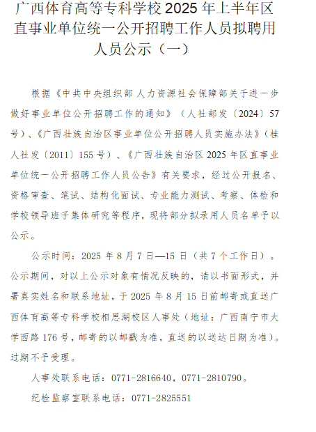 广西体育高等专科学校2025年上半年区直事业单位统一公开招聘工作人员拟聘用人员公示