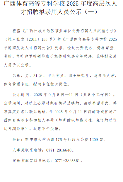 广西体育高等专科学校2025年度高层次人才招聘拟录用人员公示(一)
