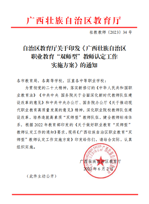 广西壮族自治区职业教育“双师型”教师认定工作实施方案(桂教教师〔2023〕34号)