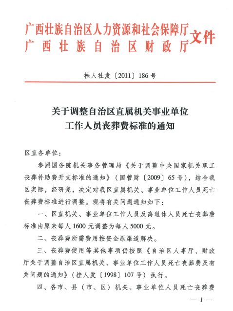 附件【桂人社发[2011]186号《关于调整自治区直属机关事业单位工作人员丧葬费标准的通知》.pdf已下载