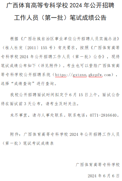 广西体育高等专科学校2024年公开招聘工作人员(第一批)笔试成绩公告